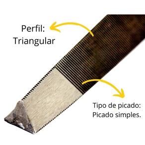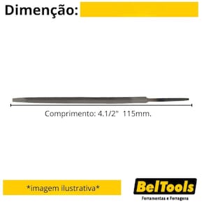 Descrição: Possui picado simples canto vivo proporcionando melhor afiação. Indicação: Indicada para afiar serrotes. Dureza: 58-62 HRC. Comprimento: 4.1/2" 115mm. Largura: 7,2 mm. Cabo: Sem cabo. Perfil: Triangular Tipo de picado: Picado simples.
