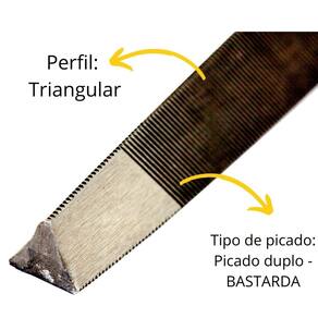 Descrição: Possui picado duplo e corte grosso que proporciona maior desbaste. Indicação: Indicada para desbastar metais com superfícies angulares internas e cantos de ângulos retos. Dureza: 58-62 HRC. Comprimento: 8" - 200mm. Cabo: Sem cabo. Perfil: Triangular Tipo de picado: Picado duplo - BASTARDA