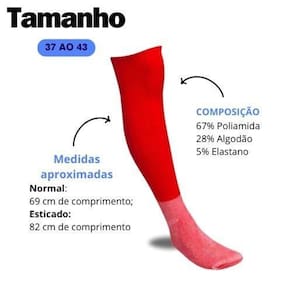 Kit c/12 Meiões de Futebol com pés em Algodão Conforto Adulto Cor: Vermelho Descrição Kit com 12 Meiões tradicionais para futebol - Ideal para fardamentos Produzido com pé em algodão que garante o conforto e evita bolhas durante a pratica do esporte. Corpo e cano do meião em poliamida e elastano garantem o suporte da caneleira e panturrilha. Medidas aproximadas: - Normal: 69 cm de comprimento; - Esticado: 82 cm de comprimento; - Tamanho: 37 ao 43. Composição - 67% Poliamida; - 28% Algodão; - 5% Elastano. Conteúdo da embalagem: - 12 pares de meias. do fabricante: 30 dias Marca: Não Informado