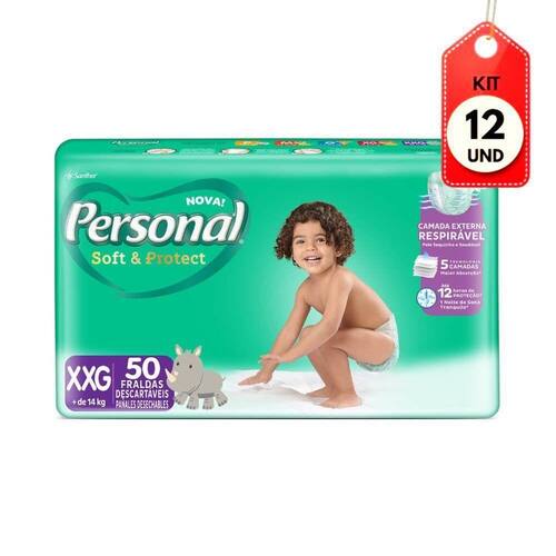 Kit C/12 Personal Soft & Protect Fralda Infantil Xxg C/50 DESCRIÇÃO:Fralda Infantil Soft & Protect Personal foi cuidadosamente desenvolvida para atender as necessidades dos pequenos, que são conforto e proteção, além de ser um produto de qualidade.AÇÃO/ATIVOS:Confeccionada com camada externa respirável, sistema Abre-Fácil que promove melhor ajuste e mais praticidade na hora da troca, cobertura macia como algodão, e tecnologia de 5 camadas que permite muito mais absorção, mantendo a pele mais sequinha e saudável por até 12 horas de proteção. Imagem meramente ilustrativa. O produto pode ter variação de cor ou desenho, porém as características gerais são as mesmas especificadas na descrição do produto.MODO DE USAR:Após limpar a pele do bebê com lenço umedecido, coloque uma fralda limpa e aberta debaixo do bumbum, ajuste para ficar centrada e então feche a fralda, fixando ambos os lados com o fecho adesivo.ESTE KIT CONTÉM: 12 UNIDADES DE PERSONAL SOFT & PROTECT FRALDA INFANTIL XXG C/50Kit C/12 Personal Soft & Protect Fralda Infantil Xxg C/50
