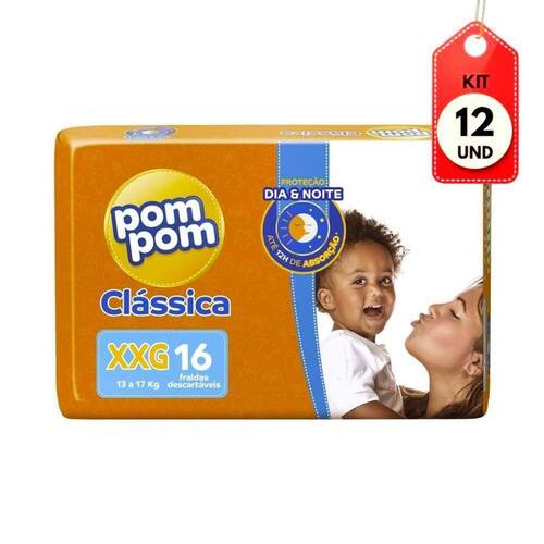 Kit C/12 Pom Pom Clássica Fralda Infantil Jumbo Xxg C/16 DESCRIÇÃO:Fralda Descartável Clássica Pom Pom conta com canais super absorventes e gel que absorve o líquido duas vezes mais rápido, assim, você terá mais tranquilidade sabrendo que seu bebê está protegido o tempo todo. AÇÃO/ATIVOS:Desenvolvida com exclusiva tecnologia que não deixa a fralda pesar e cair, protege por até 12 horas de absorção, mantendo a pele do bebê sempre sequinha. Além disso, possui barreiras que evitam vazamentos e abas elásticas que proporcionam maior conforto e ajuste a cintura do seu bebê. Imagem meramente ilustrativa. O produto pode ter variação de cor ou desenho, porém as características gerais são as mesmas especificadas na descrição do produto.MODO DE USAR:Coloque a fralda limpa e aberta debaixo do bumbum do bebê, ajustando para ficar centralizada, descole as fitas ajustáveis e fixe-as sobre a parte frontal da falda, ajustando de acordo com o corpinho do bebê. ESTE KIT CONTÉM: 12 UNIDADES DE POM POM CLASSICA FRALDA INFANTIL JUMBO XXG C/16Kit C/12 Pom Pom ClÃssica Fralda Infantil Jumbo Xxg C/16