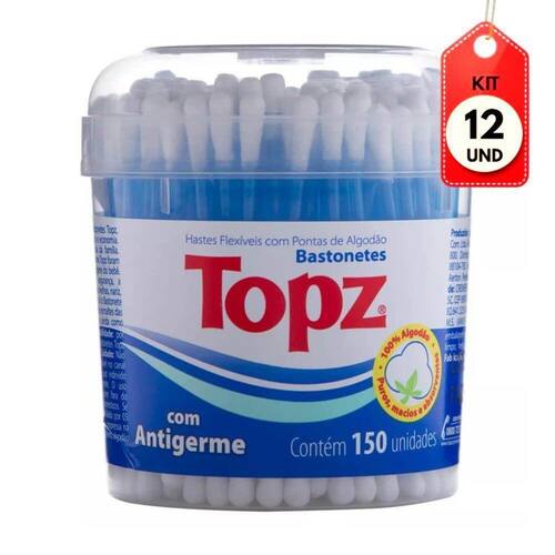Kit C/12 Topz Hastes Flexíveis Pote C/150 DESCRIÇÃO: As hastes flexíveis Topz Baby tem pontas feitas 100% de algodão e com antigerme, que são ideais para a limpeza diária do bebê.AÇÃO/ATIVOS: Indicadas para higiene de áreas delicadas como orelha, olhos, umbigo, nariz. As extremidades com barreiras protetoras de algodão, mais gordinhas, impedem que a haste entre no ouvido causando qualquer tipo de lesão.MODO DE USAR: Utilizar conforme indicação da embalagem.ESTE ANÚNCIO CONTÉM: 12 Topz Hastes Flexíveis Pote C/150Kit C/12 Topz Hastes FlexÃveis Pote C/150