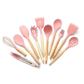 Kit C/12 Utensílios De Cozinha Silicone Cabo Madeira