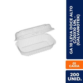ESPECIFICAÇÕES TÉCNICAS: Modelo: GA 10 Linha: Leva Doce Alto Marca: Galvanotek Quantidade: 20 pacotes com 10 unidades (total 200 un.) Cor: Transparente Material: PET Indicação: Doces, mini bolos, sobremesas, tortinhas Tampa: Fixa com vedação Uso: Festas, delivery, confeitaria Marca: Não Informado