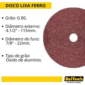 Grão: G 80. Diâmetro externo: 4.1/2" - 115mm. Diâmetro do furo: 7/8" - 22mm. Tipo de grão: Óxido de alumínio.