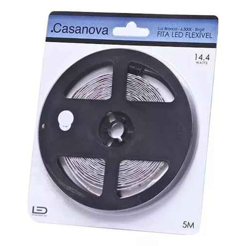 Crie efeitos luminosos e ilumine locais inusitados com a Fita de LED Flex 14,4W Bivolt 6500k Luz Branca com 5 Metros da Casanova. Produto perfeito para aplicação em salas, quartos, prateleiras, nichos e sancas.