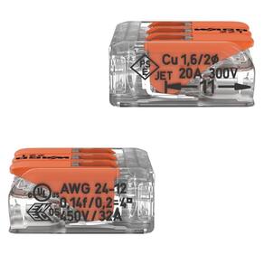 Conector de emenda; para condutores de até 4mm² com 3 entradas. Produto transparente e com alavancas laranjas. Temperatura máx. de operação 105ºC