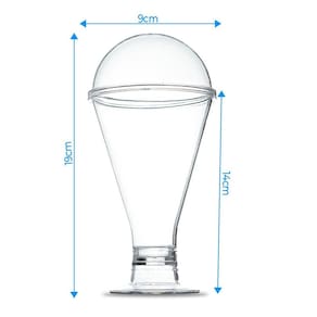 Altura com pedestal e tampa: 19cm Altura com pedestal sem a tampa: 14cm Diâmetro da boca: 9cm Peso com pedestal e tampa: 0,058kg Volume: 300ml Material: poliestireno