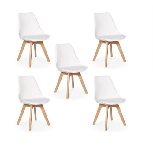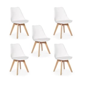 Kit C/5 Cadeira Leda Branca - Charles Eames Wood Com Almofada Cadeira Leda Charles Eames Wood Do designer finlandes Eero Saarinen, a cadeira com assento estofado Saarinen representa um trabalho icônico de design da década de 50, juntamente com a Eames. Sua concha ergonômica é produzida em PP (Polipropileno) e conta com assento fixo em tecido sintetico (PU). Seus pés são feitos em madeira com ótimo acabamento. Adequa-se perfeitamente para compor conjunto de mesa de jantar ou qualquer outro ambiente em sua casa ou escritório. Ideal para receber amigos e familiares com um toque de elegância e charme.