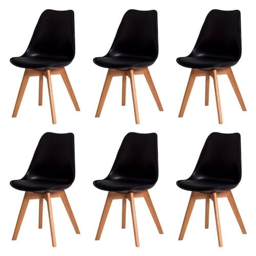 Kit C/6 Cadeiras Leda Charles Eames, Saarinen Wood Com Almofada Preta Cadeira Leda Charles Eames Wood Do designer finlandes Eero Saarinen, a cadeira com assento estofado Saarinen representa um trabalho icônico de design da década de 50, juntamente com a Eames. Sua concha ergonômica é produzida em PP (Polipropileno) e conta com assento fixo em tecido sintetico (PU). Seus pés são feitos em madeira com ótimo acabamento. Adequa-se perfeitamente para compor conjunto de mesa de jantar ou qualquer outro ambiente em sua casa ou escritório. Ideal para receber amigos e familiares com um toque de elegância e charme.