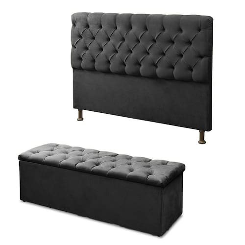 Kit Cabeceira e Calçadeira Baú Sofia Casal 140cm Veludo Preto - Montanaris Decor