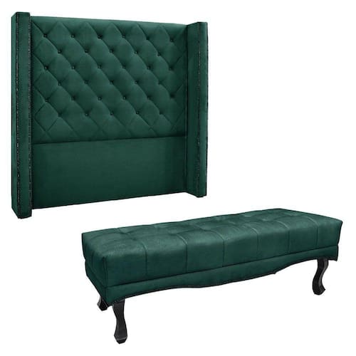 Tecido: VeludoEstrutura: Madeira EucaliptoDetalhes: Tachas em Metal FumêDensidade da Espuma da Cabeceira: D-23Montagem da Cabeceira: Acompanha manual de montagem, kit frame e parafusos para cama boxRecamier;Material dos Pés: Madeira MaciçaTipo de Pés: Pés Luiz XVDensidade da Espuma: D-26