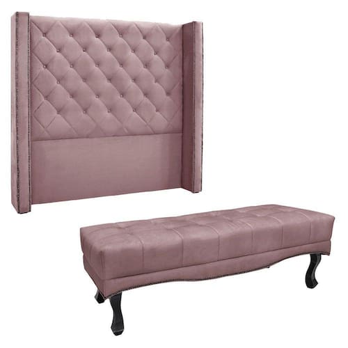 Tecido: VeludoEstrutura: Madeira EucaliptoDetalhes: Tachas em Metal FumêDensidade da Espuma da Cabeceira: D-23Montagem da Cabeceira: Acompanha manual de montagem, kit frame e parafusos para cama boxRecamier;Material dos Pés: Madeira MaciçaTipo de Pés: Pés Luiz XVDensidade da Espuma: D-26