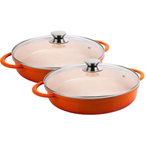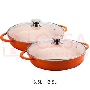 Kit com duas Caçarolas Baixa Hercules na cor Laranja sendo: 1 Caçarola Baixa de 3,5 Litros + 1 Caçarola Baixa de 3,5 Litros.