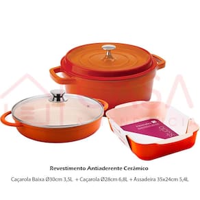 Kit Caçarolas Com Assadeira Hercules Antiaderente Ceramico Laranja Grande PA9000 Descrição: Compre já o Kit completo da linha Stúdio PA9000 Hércules e deixe sua cozinha mais charmosa e elegante. Os itens são de alumínio fundido de alta durabilidade e perfeitas para dar sofisticação no ambiente e um toque gourmet nas refeições do dia a dia. Composição do Kit: 1 Caçarola Baixa Hercules 30cm 3,5 Litros Laranja; 1 Caçarola Hercules 28cm 6,8 Litros Laranja; 1 Assadeira Hercules 35x24cm 5,4 Litros Laranja. Características da Caçarola Baixa Hercules 30cm 3,5 Litros Laranja: - Capacidade: 3,5 Litros - Tamanho: 3,5 Litros 30x6cm - Corpo Em Alumínio Fundido - Antiaderente Cerâmico - Pintura Resistente A Altas Temperaturas - Tampa de Vidro - Pode ir ao Forno e Lava Louças - Fundo Especial Para Todos Os Tipos De Fogão Fogão Convencional a gás, Indução e Halogênio - Cor: Laranja Características da Caçarola Hercules 28cm 6,8 Litros Laranja: - Capacidade: 6,8 Litros - Tamanho: 6,8 Litros 29,5x13cm - Espessura: 4,5mm - Corpo Em Alumínio Fundido - Antiaderente Cerâmico - Pintura Resistente A Altas Temperaturas - Tampa Com Sistema Pinga Gotas - Pode ir ao Forno e Lava Louças - Fundo Especial Para Todos Os Tipos De Fogão Fogão Convencional a gás, Indução e Halogênio - Cor: Laranja Características da Assadeira Hercules 35x24cm 5,4 Litros Laranja: - Capacidade: 5,4 Litros - Tamanho: 5,4 Litros 35Comprimento x 24Largura x 7,5Altura cm - Corpo Em Alumínio Fundido - Antiaderente Cerâmico - Pintura Resistente A Altas Temperaturas - Pode ir ao Forno e Lava Louças - Pode ir ao Fogão convencional e Fogão Halogênio - Cor: Laranja Especificações: Marca: Hercules; : 3 meses; ---- Aqui na Casa & Tendência você encontra os melhores utensílios domésticos e tudo que você precisa para sua cozinha ---- Marca: Não Informado