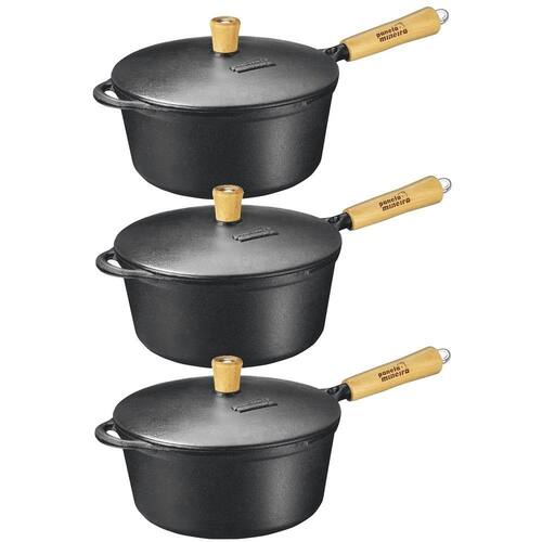 Kit Caçarolas de Ferro Tampa Ferro Cabo Madeira 19,21 e 25cm