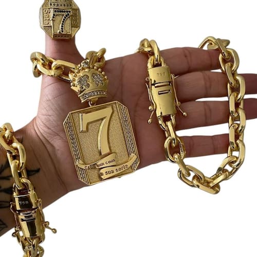 Kit Cadeado 18mm + Placa 7 + Anel Coroa Banhado a Ouro Detalhes do Produto: Material: ligas metálicas de alta qualidade, especialmente tratadas para fixação e absorção do ouro, com acabamento em verniz protetor. Aparência: visual idêntico ao ouro maciço. Produção: artesanal, com atenção meticulosa aos detalhes. Banho: 10 camadas espessas de ouro 18k, finalizadas com verniz antialérgico . Elos: soldados varia conforme o modelo . Pedras: zircônias brilhantes cravejadas quando aplicável . Tamanhos Disponíveis: Cordões Masculinos: 70cm padrão e 60cm sob consulta/Pedido Via Chat . Cordões Femininos: 50cm padrão e 45cm sob consulta/Pedido Via Chat . Pulseiras: 21cm padrão ; tamanhos de 18cm a 23cm sob consulta/Pedido Via Chat. Pingentes: conforme imagens; consulte para mais detalhes via chat. Espessuras Recomendadas para Cordões / Pingentes: P: 1mm a 4mm M: 4mm a 8mm G: 6mm a 13mm Gg: 12mm a 18mm Incluso na Compra: Saquinho de organza para armazenamento seguro. Caixa elegante, perfeita para presente. Cupom de desconto para a próxima compra. Flyer com outros produtos da coleção. Carta de agradecimento personalizada. Adesivo da marca ToJoia18k. Informações Adicionais: : 6 meses termos acompanham o produto . Devolução: 7 dias para devolução sem questionamentos. Envio: despacho em até 24 horas úteis após confirmação do pagamento. Cuidados com a Peça: Evite contato com produtos químicos; aguarde o perfume secar antes de usar. Evite contato com shampoo, condicionadores e suor excessivo. Armazene em local seco, preferencialmente no saquinho de organza fornecido. Uso no mar e piscina é permitido; lave com água corrente e sabão neutro após. Por que Escolher a ToJoia18k Semi-joias luxuosas que combinam estilo, qualidade e sofisticação. Banho espesso de ouro 18k, garantindo brilho duradouro e acabamento impecável. Design exclusivo e produção artesanal, perfeitos para qualquer ocasião. Materiais premium que asseguram durabilidade. Ao escolher uma semi-joia ToJoia18k, você investe em qualidade, elegância e uma experiência única. Aguardamos sua compra Observação: pode ocorrer variação no fecho raramente . Imagens reais, sem edição. Qualquer dúvida, estamos à disposição para esclarecimentos.