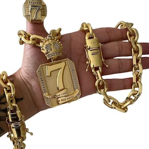 Kit Cadeado 18mm + Placa 7 + Anel Coroa Banhado a Ouro Detalhes do Produto: Material: ligas metálicas de alta qualidade, especialmente tratadas para fixação e absorção do ouro, com acabamento em verniz protetor. Aparência: visual idêntico ao ouro maciço. Produção: artesanal, com atenção meticulosa aos detalhes. Banho: 10 camadas espessas de ouro 18k, finalizadas com verniz antialérgico . Elos: soldados varia conforme o modelo . Pedras: zircônias brilhantes cravejadas quando aplicável . Tamanhos Disponíveis: Cordões Masculinos: 70cm padrão e 60cm sob consulta/Pedido Via Chat . Cordões Femininos: 50cm padrão e 45cm sob consulta/Pedido Via Chat . Pulseiras: 21cm padrão ; tamanhos de 18cm a 23cm sob consulta/Pedido Via Chat. Pingentes: conforme imagens; consulte para mais detalhes via chat. Espessuras Recomendadas para Cordões / Pingentes: P: 1mm a 4mm M: 4mm a 8mm G: 6mm a 13mm Gg: 12mm a 18mm Incluso na Compra: Saquinho de organza para armazenamento seguro. Caixa elegante, perfeita para presente. Cupom de desconto para a próxima compra. Flyer com outros produtos da coleção. Carta de agradecimento personalizada. Adesivo da marca ToJoia18k. Informações Adicionais: : 6 meses termos acompanham o produto . Devolução: 7 dias para devolução sem questionamentos. Envio: despacho em até 24 horas úteis após confirmação do pagamento. Cuidados com a Peça: Evite contato com produtos químicos; aguarde o perfume secar antes de usar. Evite contato com shampoo, condicionadores e suor excessivo. Armazene em local seco, preferencialmente no saquinho de organza fornecido. Uso no mar e piscina é permitido; lave com água corrente e sabão neutro após. Por que Escolher a ToJoia18k Semi-joias luxuosas que combinam estilo, qualidade e sofisticação. Banho espesso de ouro 18k, garantindo brilho duradouro e acabamento impecável. Design exclusivo e produção artesanal, perfeitos para qualquer ocasião. Materiais premium que asseguram durabilidade. Ao escolher uma semi-joia ToJoia18k, você investe em qualidade, elegância e uma experiência única. Aguardamos sua compra Observação: pode ocorrer variação no fecho raramente . Imagens reais, sem edição. Qualquer dúvida, estamos à disposição para esclarecimentos. Marca: Não Informado Ean: 7891186756552