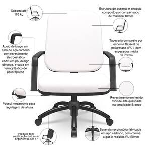 SizeDescription: Altura: 115 cm x Largura: 71 cm x Profundidade: 73 cm | ColorFamily: Branco | Com aro para pés: Não | de registrocertificação INMETRO: ABNT NBR 13962, NR 17 | ProductLength: 73 cm | ProductWeight: 59 kg | Modelo: Magno | Formato de venda: Kit | Materiais do aro para pés: na | ColorSupplier: Branco | Cor: Branco | Material: Base Giratória de Aço Carbono, Espuma ível Poliuretano, Vinil | Requer montagem: Sim | Com apoio de braços: Sim | ProductContents: 02 Cadeiras Fixas, 01 Cadeira Giratória, manual de instruções | ProductHeight: 115 cm | ProductWarranty: 90 dias após o do produto | SupplierSimpleName: Kit Cadeira de Escritório Giratória e 2 Cadeiras Fixas Preta Magno P03 Vinil Branco - Lyam Decor | MaterialFamily: Vinil | ColorSimple: Branco | Color: Branco | OriginState: PR | Com rodas: Sim | ProductWidth: 71 cm | Modelo detalhado: Magno Fixa e Magno Giratória Base Preta | Tipo de cadeira de escritório: Cadeira Giratória Operativa Plus Size | Model: Magno | OriginCountry: | ProductInstructions: Produto para uso em ambiente interno, nao devendo ficar exposto ao sol, calor e umidade excessivos. | Material do estofamento: Vinil