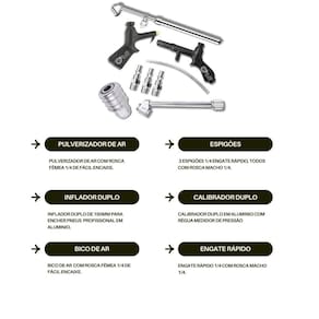 Kit de Acessórios para Compressor de Ar - Completo para Diversas Aplicações Este kit completo de acessórios para compressor de ar é ideal para quem busca versatilidade e eficiência em suas atividades diárias. Inclui: 1 Ferramenta de aplicação de ar com bico curto 1 Ferramenta de aplicação de ar com bico alongado 3 Conectores engate rápidos macho 1 Engate Rápido 1/4 com rosca 1/4 1 Inflador 150mm com rosca 1/4 1 Calibrador Pneu 150 Lbs Caminhão Profissional Aplicações: - Limpeza de superfícies e equipamentos Encher pneus e infláveis Conectar e desconectar mangueiras de ar rapidamente Compatibilidade: ideal para uso em oficinas, garagens e indústrias Compatível com a maioria dos compressores de ar disponíveis no mercado Características: alta resistência e durabilidade Fácil de usar e instalar Versatilidade para diversas tarefas Garanta já o seu kit e otimize suas atividades com ferramentas de qualidade e confiabilidade. Ideal para quem busca eficiência e praticidade no dia a dia. Marca: Não Informado Ean: 0789168678107