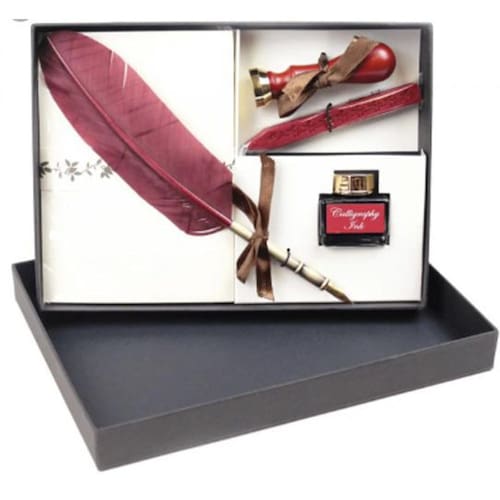 Lindo Kit de Caligrafia com produtos em tons bordô, para presentear com carinho e com classe quem você gosta. Dentro de um estojo, todos os itens são acoplados de forma organizada e perfeita para que sua apresentação seja incrivelmente linda como seus produtos internos são. O estojo acompanha: 1 bico de pena de escrita tradicional; 1 vidro de tinta caligráfica 1 sinete para lacre modelo Sol; 1 cera para lacre cor vinho; 10 cartões 10 envelopes Modelo: SK 086 Fabricado por Kentaur