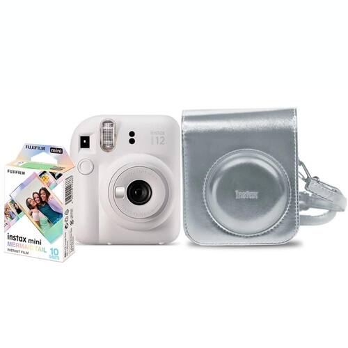 Este kit é composto por uma câmera Instax Mini 12 na cor branco marfim, um pack de filmes Instax Mini Mermaid Tail com 10 fotos e uma linda bolsa oficial Instax Mini 12 prateada e com alça para transporte. A bolsa é modelada exclusivamente para o modelo Mini 12 da Instax e acomoda a câmera perfeitamente!