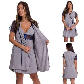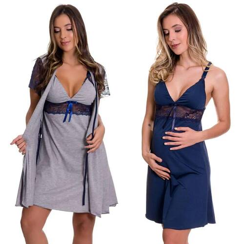 Camisola amamentação com robe cinza em viscolycra e renda, camisola azul marinho é confeccionada em microfibra.