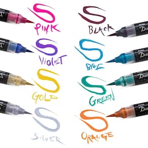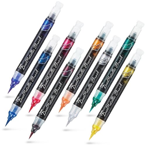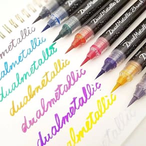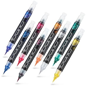 Kit Caneta Pincel Dual Metallic Brush! Este pincel possui um sistema de bombeamento para recarga de tinta. Além disso, possui duas cores em uma única caneta! A tinta se adapta para cada tipo de papel aplicado, preto ou branco. A ponta do pincel é nylon e super flexível. Ótimo para cartões, convites, lettering, desenhos e outros designs. Dá um super destaque para as ilustrações e textos! Disponíveis em 8 cores maravilhosas.