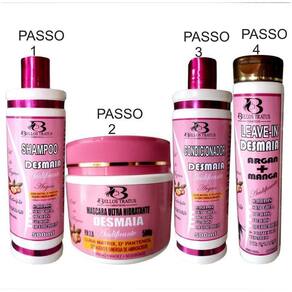 O kit desmaia acidificante bellos tratus cosméticos contém uma sinergia de ativos como luna matrix, d-pantenol, colágeno, l- arginina, óleo de árgan e óleo de uva tem um ótimo ph capilar 2,8.Linha acidificante serve para baixar novamente esse ph e assim fechar as escamas dos fios. O acidificante vai fazer com que o cabelo fique mais alinhado, suave e macio. O uso frequente desse tipo de produto ajuda também a fazer com que os fios absorvam melhor os produtos que forem posteriormente aplicados, como condicionador, máscara, leave-in de um ph 2.8 e o shampoo ph 3,5 a 4,0 conseguem reter melhor os nutrientes.Repõe as proteínas, protegendo, reconstruindo, fortalecendo e protegendo a cor dos fios dos cabelos. Em sua formulação são utilizadas matérias-primas de última geração baseadas em nanotecnologia que penetram profundamente na fibra recuperando a estruturas, balanceando a umidade, fortalecendo e devolvendo a elasticidade dos fios e repositor de lipídeos, massa e repositor de carbono capilar.Kit contém 1 shampoo 500ml, 1 condicionador 500ml, 1 máscara500gr e 1 leave-in 400ml.Serve para todos os tipo de cabelos lisos, adulados e cacheados. Marca: Bellos Tratus Cosmeticos