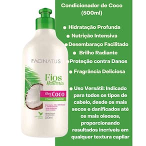 O Óleo de Coco é extremamente nutritivo para cabelos porosos e desidratados. Ele constitui uma barreira protetora para manter a umidade e penetra nas camadas mais profundas do mesmo, o que ajuda a manter cabelos mais fortes e flexíveis. É um excelente emoliente com extratos naturais, promove brilho, maciez e ação Anti-Frizz.