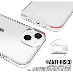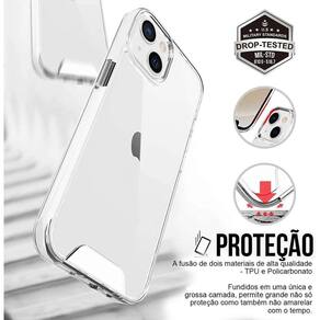 Capinha space Collection A capa Space Collection protege seu aparelho contra eventuais quedas, arranhões além de dar uma sensação de segurança na pegada do seu celular. Sendo 100% transparente mantem a originalidade e a beleza natural do seu aparelho. Além de possuir cantos reforçados que evitam ainda mais os fortes impactos causados por quedas. Seus botões cromados possuem tecnologia individual que permitem que você tenha um toque macio e preciso no acionamento dos botões de função. A traseira possui ressaltos que não deixam arranhar a sua capa, mantendo assim sempre o aspecto de novo em seu aparelho. A capa Space Collection é produzida em Policarbonato PU e Poliuretano Termoplástico TPU de alta qualidade, que fundidos entregam uma proteção muito superior as capas tradicionais de TPU. Não amarela com o tempo -- Película de Vidro 3D Blindada - Armyshield A película de vidro 3D para celular é um produto de alta qualidade que oferece proteção e estilo para o seu dispositivo móvel. Feita de vidro temperado de alta resistência, a película é projetada para se encaixar perfeitamente na tela do seu celular, proporcionando uma cobertura completa e proteção contra arranhões, rachaduras e outros danos. A película de vidro 3D é especialmente projetada para se curvar suavemente ao redor das bordas do seu celular, criando uma aparência elegante e sem bordas. Isso significa que você pode desfrutar de uma experiência de visualização imersiva e sem interrupções, sem se preocupar com a película descolando ou interferindo na sensibilidade da tela.