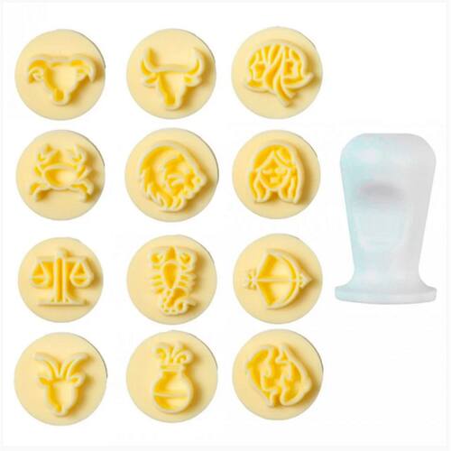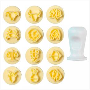 Kit carimbos signos (2cm). São doze opções de carimbos para tornar suas decorações encantadoras, acompanha um cabo que encaixa e facilita no momento de utilizar. Aplique de forma rápida e prática em seus doces, experimente carimbar com pó ou glitter e destaque ainda mais os desenhos. Eleve o nível de seus trabalhos, lembrancinhas, decorações e surpreenda seus clientes!