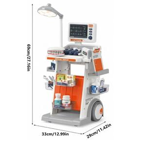 Este é um carrinho de brinquedo de médico, com um design realista que simula um carrinho de hospital de verdade. Ele vem com vários acessórios de faz de conta, como um monitor que simula um eletrocardiograma (ECG) e uma lâmpada que imita as de consultório. O carrinho possui diversas prateleiras e compartimentos para organizar os frascos de remédios de brinquedo, além de uma gaveta para guardar acessórios médicos como seringas e outros instrumentos. A estrutura do carrinho é feita de plástico durável, e suas rodinhas permitem que a criança o leve para onde quiser.