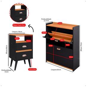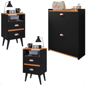 A Mesa de Cabeceira conta com duas amplas gavetas e um nicho aberto, atributos essenciais para exibir objetos decorativos ou organizar itens de uso diário. Já a Sapateira possui gavetas basculantes com amplo espaço para a organização de calçados, mantendo tudo em seu devido lugar.