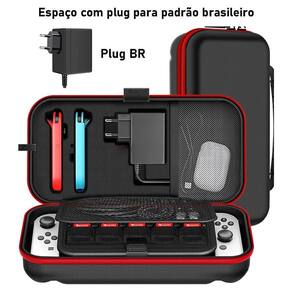 Características: - Compatibilidade: Nintendo Switch OLED - Material do case: EVA rígido e tecido - Itens inclusos: Case, película de vidro, kit de instalação, 4 grips para analógicos - Tipo de carregador suportado: Plug brasileiro - Cor principal: Preto com detalhes em vermelho - Marca: 123Games