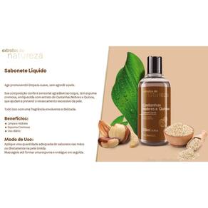 Kit Extratos da Natureza Castanhas Nobres e Quinoa Fragância Sofisticada, hidratação para pele seca. Sabonete Líquido : Age promovendo limpeza suave, sem agredir a pele. Sua composição confere sensorial agradável ao toque, tem espuma Cremosa, enriquecida com extrato de Castanhas Nobres e Quinoa, Que ajudam a prevenir o ressecamento excessivo da pele. Tudo isso com uma fragrância envolvente e delicada. Benefícios: Limpa e Hidrata Espuma Cremosa Uso diário