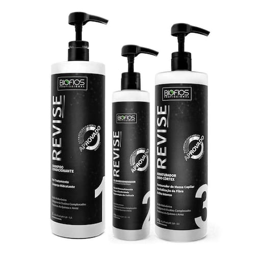 Kit Cauterização/Reconstrução Revise - 3 Passos Serviço SosContémShampoo condicionante - revise - 1lGel reconstrutor - revise - 500gRenaturador endo cortéx - revise - 1kg AtivosTodo o kit revise possui:- ácido hialurônico: penetra nos fios reconstruindo a fibra capilar e melhorando a elasticidade, aumentando assim a resistência dos fios.- colágeno e elastina complexados: melhoram a elasticidade e a flexibilidade dos cabelos, deixando-os com a aparência jovem e mais saudável. - proteínas da quinoa e arroz: tem ação anti-queda, ajudando a manter os cabelos fortes e ajudam a reparar a fibra capilar.Como usarAplique o shampoo condicionante revise sobre os cabelos molhados e massageie o couro cabeludo suavemente e então enxágue completamente, removendo todos os resíduos.Com os cabelos limpos e úmidos, aplique o revise gel bioregenerador de maneira uniforme sobre toda a extensão dos fios e deixe agir por 5 minutos. Não enxágue. Prossiga com a aplicação do revise renaturador endo cortéx.Ainda com o gel reconstrutor revise no cabelo, aplique o renaturador endo cortéx revise de maneira uniforme sobre toda a extensão dos fios e deixe agir por 5 minutos. Não enxágue. Prossiga com a aplicação do revise renaturador endo cortéx.Com uma toalha, retire o excesso de umidade dos cabelos e pulverize uma pequena quantidade do spray inversor de cargas revise. Para a finalização, escove ou deixe secar naturalmente.- dica: você também pode utilizar o spray inversor de cargas revise para a finalização diária dos seus fios. Resultado Cabelos totalmente recuperados no primeiro uso. Redução de frizz e pontas duplas, fios hidratados, sedosos e brilhosos.