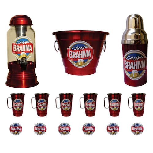 Kit Cerveja Completo BrahmaEste Kit Contém:1 Cervejeira/Chopeira Dimensões: Altura 43 cm x Largura 20 cm Capacidade: 2,5 litros Cilindro para Gelo: Sim Material: Vidro, Alumínio e Torneira em Plástico. Recipiente para armazenar bebidas com Dispenser de Gelo para manter a bebida sempre gelada1 Balde Alumínio 6 Litros Tamanho: Altura: 20 cm | Diâmetro da base: 20 cm | Diâmetro da Boca: 28 cm Ideal para 4 garrafas de 600 ml ou 6 Long Neck6 Porta Copos MDF envernizados Feito em MDF cortado a laser, adesivado e envernizado. pode molhar Tamanho: Diâmetro: 8,3 cm1 Porta Garrafas de 600 ml Tamanho: Altura 27 cm | Diâmetro: 10,5 cm6 Canecas Alumínio Tamanho: Diâmetro: Atura: 14,5 cm | Diâmetro da Base 6,5 cm | Diâmetro da Boca 10 cm Capacidade 600 ml