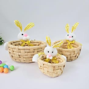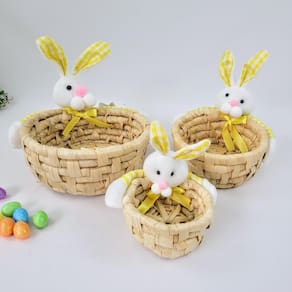 design Natural e Elegante: Cada cesta é feita de fibra natural, proporcionando um visual rústico e sofisticado. adornos Delicados: Coelhos em tecido conferem um charme único às cestas, tornando-as ideais para uma decoração temática de Páscoa. variedade de Tamanhos: Possibilita diferentes usos na mesa posta, desde servir pães e biscoitos até guardar guardanapos ou pequenos arranjos.