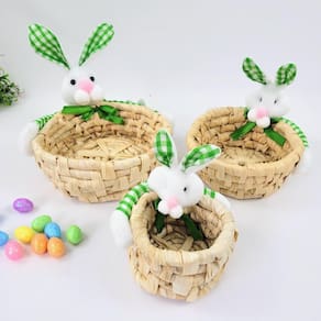 design Natural e Elegante: Cada cesta é feita de fibra natural, proporcionando um visual rústico e sofisticado. adornos Delicados: Coelhos em tecido conferem um charme único às cestas, tornando-as ideais para uma decoração temática de Páscoa. variedade de Tamanhos: Possibilita diferentes usos na mesa posta, desde servir pães e biscoitos até guardar guardanapos ou pequenos arranjos.