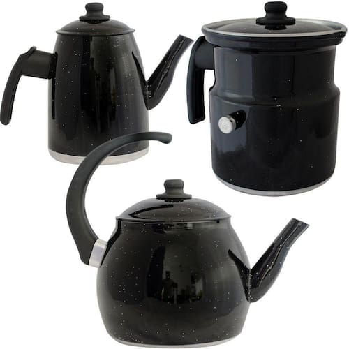 Kit Chaleira Leiteira E Bule Gulê Alumínio 3 Peças Preta Kit Chaleira Leiteira E Bule Gulê Alumínio 3 Peças Preta - Dica do chefe. Após o uso caso surja machas no interior da tampa ou da panela, basta ferver água com limão e vinagre branco para a remoção.