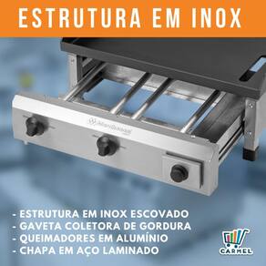 Com ampla área de fritura (50 cm), entrada de gás na parte frontal, chapa dobrada em aço laminado e fácil controle e visualização da chama, elas proporcionam praticidade, agilidade e comodidade na utilização.