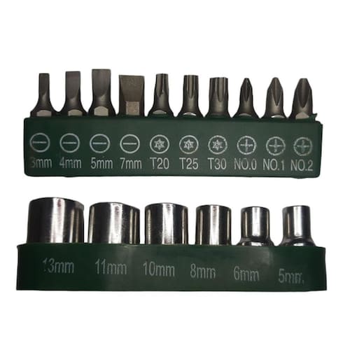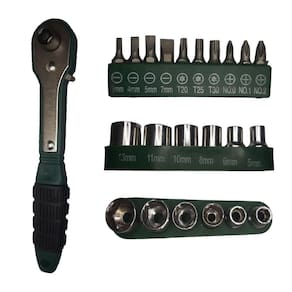Kit chave catraca reversivel com canhao + soquete com 17 peçasref: f-206fabricantepen techvalidade: indeterminadatamanho aproximado da chave: 15cmtamanho aproximado da embalagem: a:19,5xl:11,5cmpeso aproximado: 215gcor: verde e pretocomposição: metal e plástico