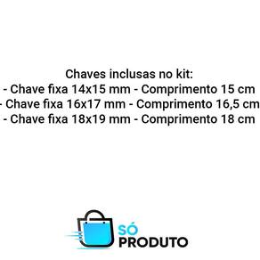 Chaves inclusas no kit: - Chave fixa 14x15 mm - Comprimento 15 cm - Chave fixa 16x17 mm - Comprimento 16,5 cm - Chave fixa 18x19 mm - Comprimento 18 cm