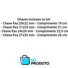 Chaves inclusas no kit: - Chave fixa 20x22 mm - Comprimento 19 cm - Chave fixa 21x23 mm - Comprimento 21 cm - Chave fixa 24x26 mm - Comprimento 22,5 cm - Chave fixa 27x32 mm - Comprimento 26 cm