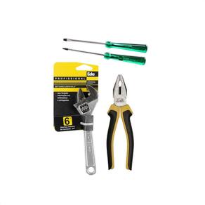 Conteúdo da embalagem: - 01 chave inglesa boca ajustável 6. - 01 alicate universal 8 de aço carbono com cabo emborrachado. - 01 chave de fenda 3/16 x 4 imantada. - 01 chave philips 3/16 x 4 imantada. Marca: Não Informado