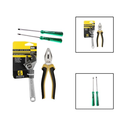 Especificações: - marca: eda; - modelos: 6ep, 7za, 9to e 9ui; - material da chave inglesa: aço carbono - material do alicate universal: aço carbono e plástico; - material das chaves fenda e philips : aço crv e plástico pvc; - tamanho da chaves fenda e philips : 3/16 x 4; - comprimento do alicate universal: 8 200mm ; - abertura total do alicate universal: 29mm;
