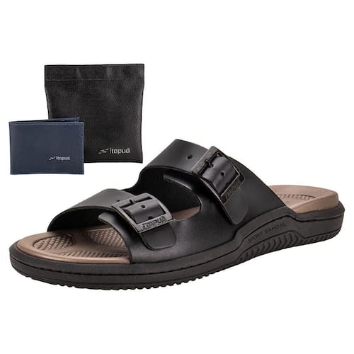 O Kit Chinelo Masculino e Carteira Itapuã 6831 é uma escolha prática e estilosa. O chinelo, feito de couro com acabamento colado/costurado, possui palmilha de EVA e sola de PVC. Acompanha uma carteira Itapuã, cuja cor pode variar conforme o estoque.