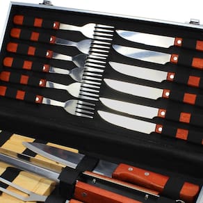 Itens inclusos: 6 faca de 20 cm 6 garfo de 20,5 cm 1 faca do chef 30,5 cm 1 pegador de carnes 36,5cm 1 garfo de carnes 30cm 1 tábua 01 maleta de 47 cm x 20cm x 7 cm