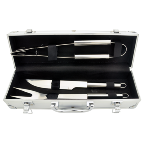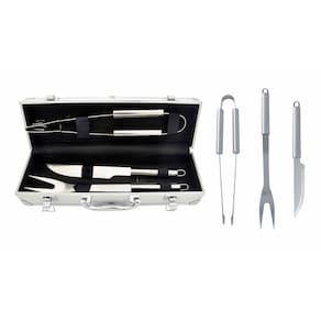 KIT CHURRASCO 3 PEÇAS EM INOX + MALETA DE ALUMÍNIOO Kit contém 01 Faca + 1 Grafo + 1 Pegador, todos em inox de alta qualidade, com 1,5 mm de espessura, o que garante melhor resistência e durabilidade.A maleta é confeccionada em Alumínio, com duas dobradiças com presilhas para travar a maleta a alça. A parte interna é revestida em TNT e fecho aderente para segurar as peças.Produto com ótimo acabamento para realçar seu espaço Gourmet.Obs: Área exclusiva, na caixa, para gravação. Coloque o nome da sua empresa ou o nome de quem vai receber o presente. (O comprador é quem vai mandar fazer a gravação em local de sua confiança. Nós não fazemos a gravação)O KIT CONTÉM:01 Faca de 30 cm01 Garfo de 30 cm01 Pegador de 30 cm01 Maleta de 32 cm x 9 cm x 7 cm (C x L x A)Material: Aço Inox e Alumínio.